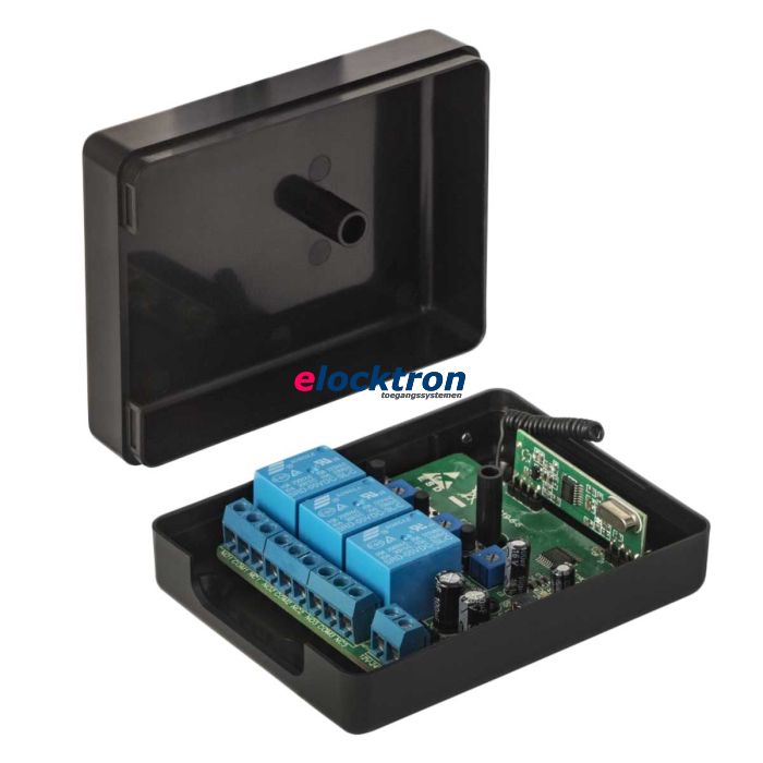 Deze makkelijk te bedienen en te programmeren zenders en ontvangers zijn geschikt voor het schakelen van elektrische vergrendelingen, automatische deuren of andere toepassingen. Er is keuze uit 1 of 3 kanaals zenders en ontvangers met 1 of 3 relais. De codeoverdracht is rollend met 260 miljoen combinatie mogelijkheden (KeeLoq encryptie) dus wisselend bij elke zendimpuls. Alle ontvangers zijn uitgevoerd met puls- of continucontact.