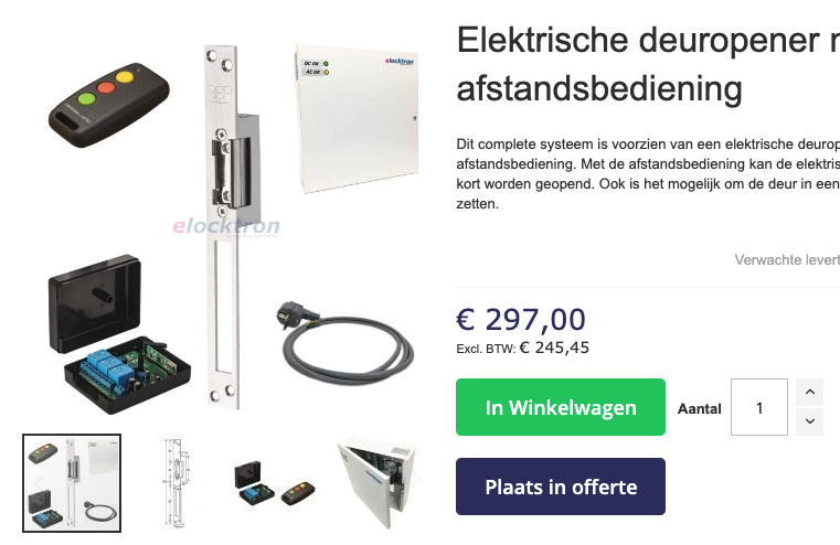 In de webwinkel kun je op een productpagina rechtstreeks producten toevoegen in een offerteaanvraag. Op de afbeelding hiernaast zie je een voorbeeld van de productpagina. De blauwe knop plaats in offerte staat onder de groene winkelwagen knop.