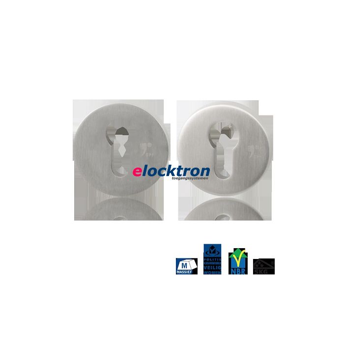RVS mat ronde veiligheidsrozet 55x10mm SKG*** RVS wordt ook wel roestvast staal genoemd. Zijn producten waarbij het basis materiaal een geborstelde of gepolijste bewerking krijgt. Zo kunt u kiezen uit een matgeborstelde of een glanzend gepolijste veiligheidsrozet.