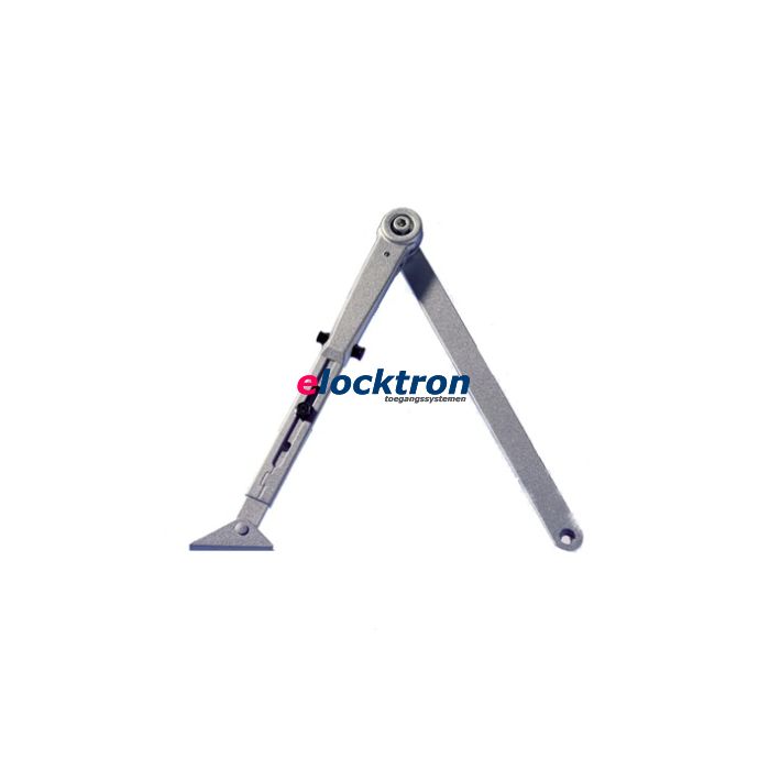 Schaararm voorzien van in- en uitschakelbare mechanische vastzetting, waarmee de vastzethoek traploos instelbaar is tussen 70° - 150°